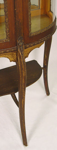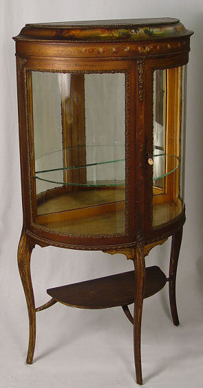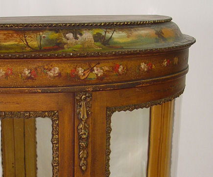VERNIS MARTIN TYPE DEMI LUNE DISPLAY CABINET: Early 20th C, paint decorated with cherubs and flowers. Demi-front with one half opening as the door. Glass is framed in ornate gilt metal. Elegantly worn chic condition. 56 1/2'' h. x 28 1/2'' x 14 1/2''.