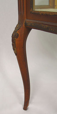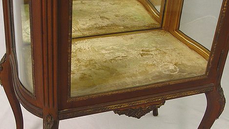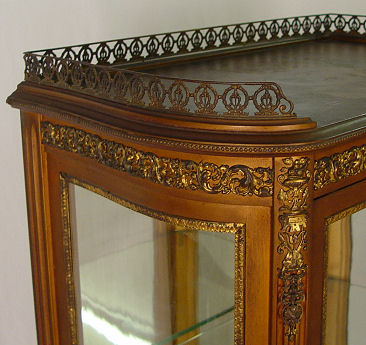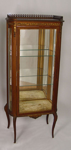 FRENCH VITRINE CURIO DISPLAY CABINET: Early 20th C. Curved glass sides, single door with mirror back interior and 2 glass shelves. Glass framed in gilt metal, reticulated gallery. 59 1/4'' h. x 24 1/4'' x 15 1/2''.