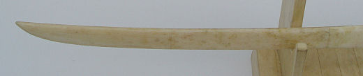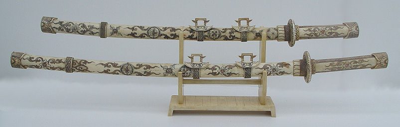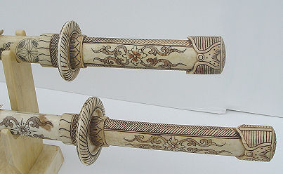 DECORATIVE BONE KATANA SWORD SET: Engraved design scabbards, bone blades, bone veneer stand. The larger of the two is 35'' overall, the shorter is 30''l. overall. Entire display is 9 1/2''h.