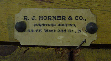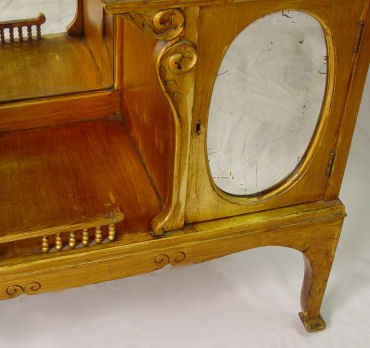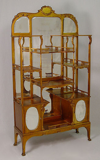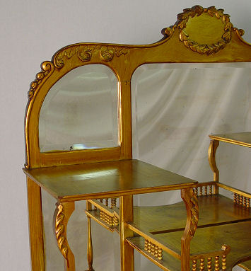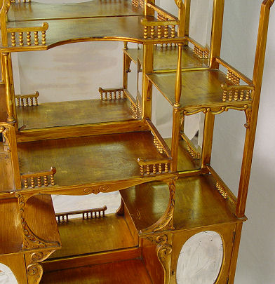 R.J. HORNER ETAGERE: Antiqued gold finish on mahogany. Beveled mirrors back open display shelves with turned spindle supports. Bears the RJ Horner Co. celluloid label. 67''h x 35'' x 12''.