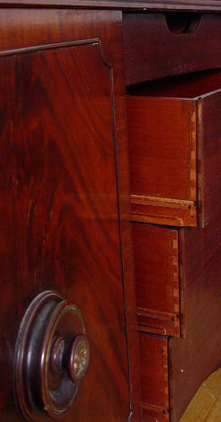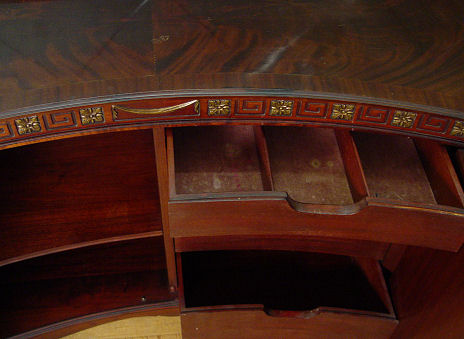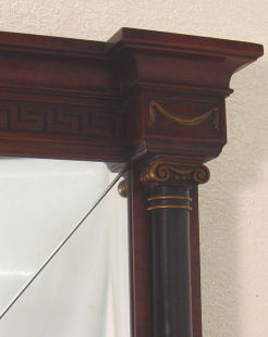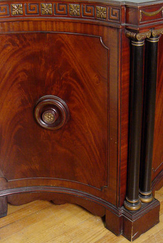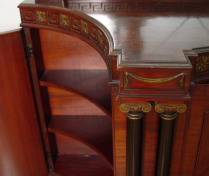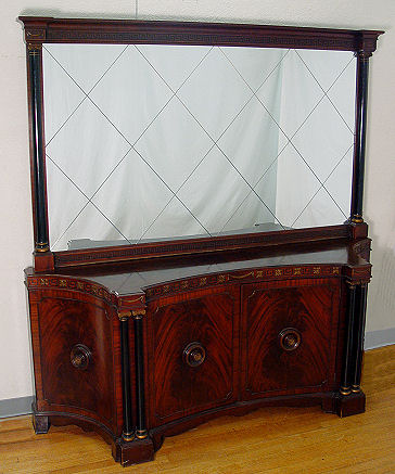 FLAME GRAIN MAHOGANY FRENCH EMPIRE STYLE MIRRORED SERVER: A dramatically shaped flame grain mahogany veneer base featuring ebonized columnar stiles. Interior center of cabinet has drawers on one side, shelves on the other. The mirror is reverse cut in a harlequin pattern, and framed with columns. Greek Key, swag and foliate carving decorate the top rail and mirror. Cabinet measures approx. 33''h. x 80''w including feet, & 22'' deep, mirror measures 79 1/2'' w. x 47 1/2'' h., original mirror supports included. Overall approx. 80''h.