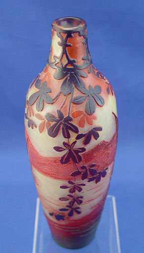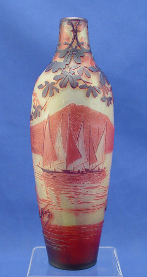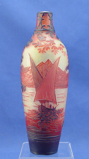 DE VEZ FRENCH CAMEO ART GLASS VASE: Layered and cut blood red to the palest green. View of the boats on the water as seen through the leafy branches, signed 8'' h. Est. $1200/1500**