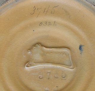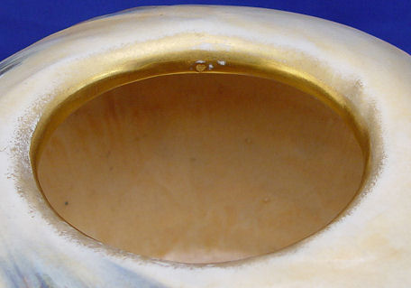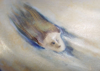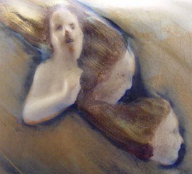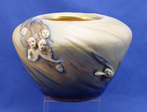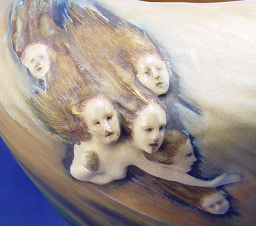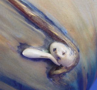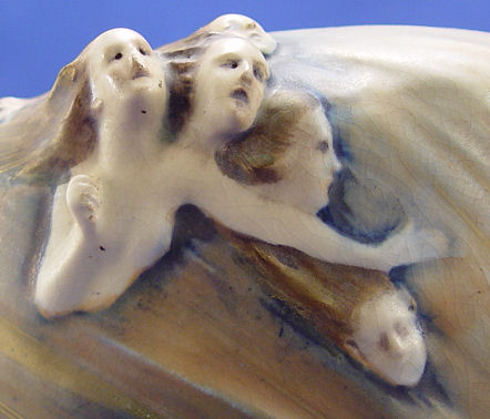 ART NOUVEAU AMPHORA VASE FROM THE FATES SERIES: Iridized greenish glaze with swirls of blue. From the series first presented at the World Exposition in 1904. Dramatic theme showing dimensional faces, 11 in all. Riessner Stellmacher & Kessel, Turn Teplitz. No cracks, though wear on two of the noses. Approx. 6''h, 9'' dia. at the widest.