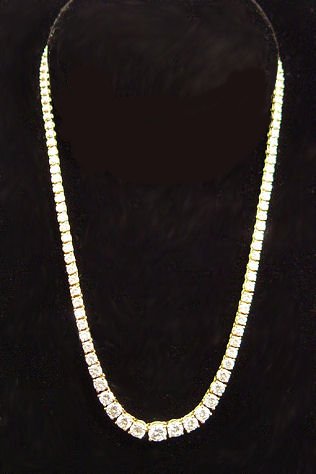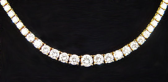 11CTW DIAMOND RIVIERA NECKLACE: One hundred and eleven round full cut diamonds prong set in 18k yellow gold. Graduating in size from .61pts to .07pts, G-H color and VS1-SI1 clarity. Approx. 24 grams, 16''l., pressure clasp with hidden safety, marked 18k. With copy of 1999 insurance appraisal, replacement cost $13,850.00.
