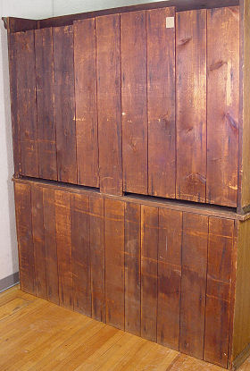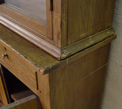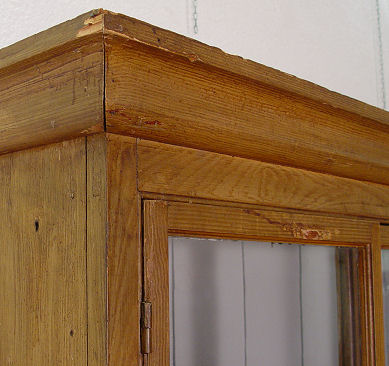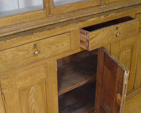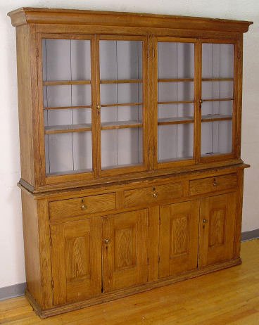 AMERICAN COUNTRY STEP-BACK CUPBOARD, CA 1850: Grain painted two part pine cabinet. Upper section of four glass doors, painted and shelved interior. Base of 3 drawers over 4 solid doors. Dove tail and square nail construction. 83 1/2''h. x 77''w. approx. 16 1/2''d. Est. $2500/3500**