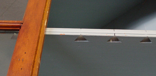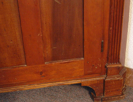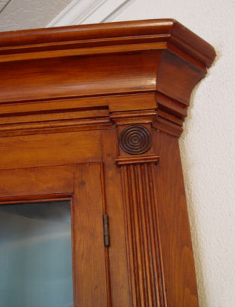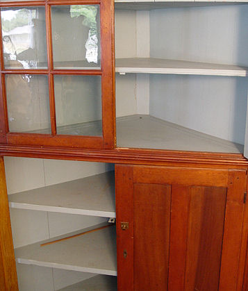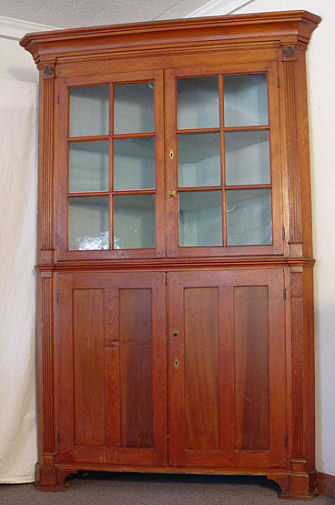 19TH C AMERICAN CORNER CABINET: One part cabinet with upper section having overhanging cornice, 12 individually glazed panes on the two doors and blue painted interior. The glass appears to be original. Lower section with paneled double doors. Peg and nail construction. 83''h, 51'' across the front.