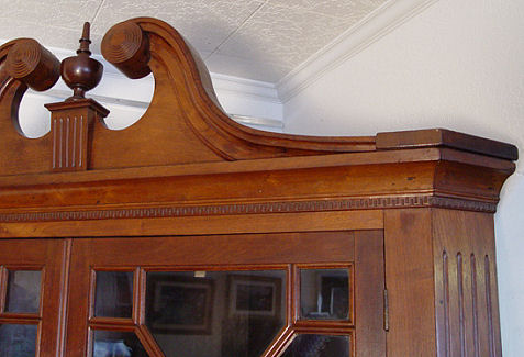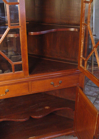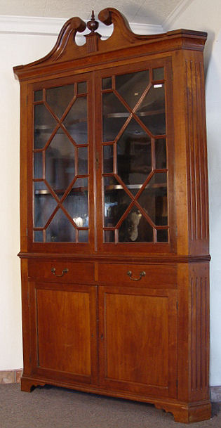 19TH C FEDERAL STYLE MAHOGANY CORNER CABINET: One piece cabinet with upper section of glazed glass doors, interior of shaped shelves. Swan neck broken pediment centering urn finial. Lower section of double doors, the interior repeats the shaped shelf. Mahogany and mixed wood. Approx. 90''h. x 51'' across the front.