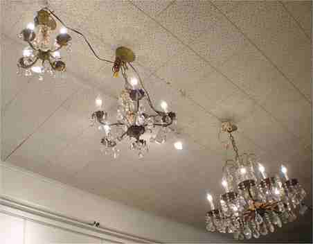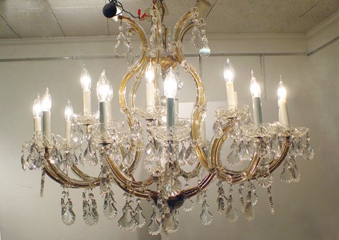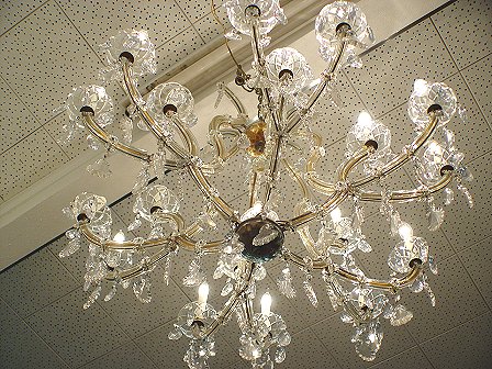 MURANO GLASS 18 LIGHT CHANDELIER: Six curved arms, each with 3 lights. Interior hollows of the arms have a gold coloration. Dripping in shaped cut prisms. Approx. 28''h. (excluding the chain), 36'' dia.