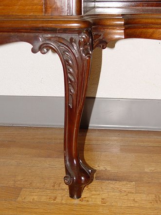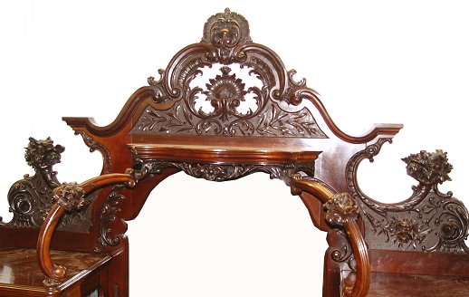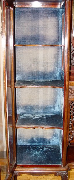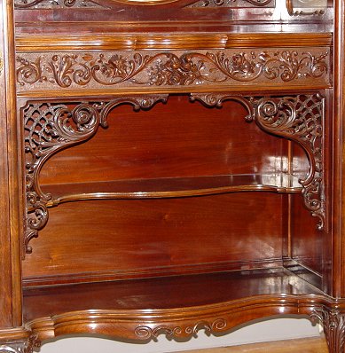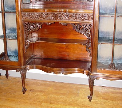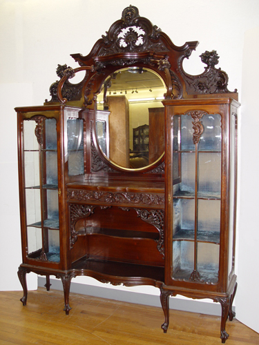 MONUMENTAL EDWARDIAN MAHOGANY ETAGERE: Late 19th C. The best of the best. Deep rich dark mahogany with center open front display flanked by tall glass front displays anchored by a shaped mirror. Carvings and pierce work throughout. Cabriole legs. Approx. 8'h. x 5' x 17''.