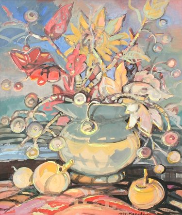 KOVALEVSKA, M.(Latvian, 20th C.): Still Life with Fruit and Flowers, O/B, 31 3/4'' x 27 1/2'', overall 35 1/4'' x 30 3/4''. From the estate of Fred Eglitis.