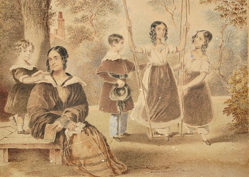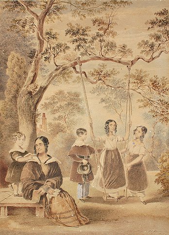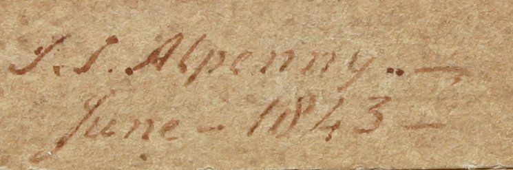ALPENNY, Joseph, (Irish, 1787-1858): Young Family, W/C, 13 3/4'' x 10'', sign J.S. Alpenny, dated June 1843, 18'' x 14'' in worn frame. Laid on support board of the period, scattered abrasions with insect damage, some fading of colors, moisture staining to lower margins of support board.