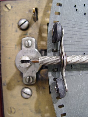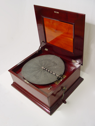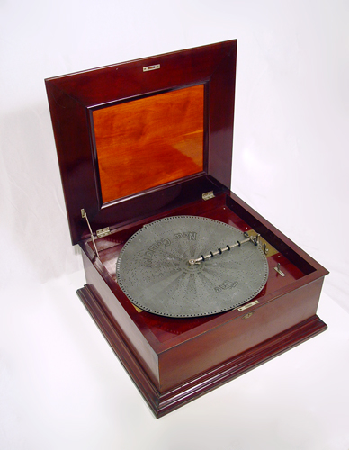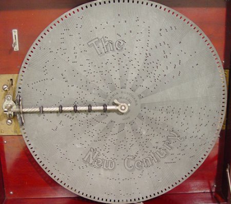 EARLY 1900'S NEW CENTURY DISC MUSIC BOX: In a cherry and mahogany case, in beautiful working order. Sold with 13 discs. The case is 12''h. x 24 1/2'' x 22'', the discs are 16 1/2'' dia.