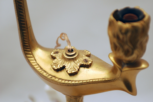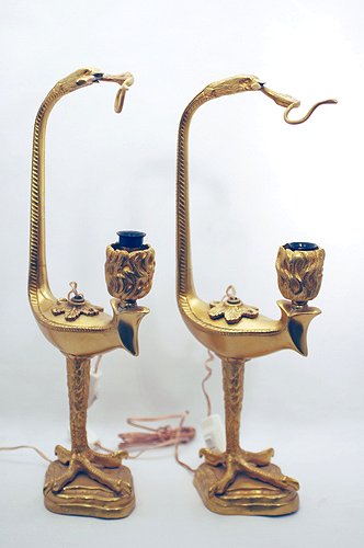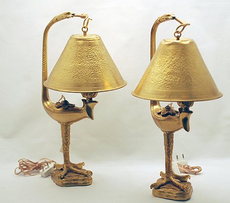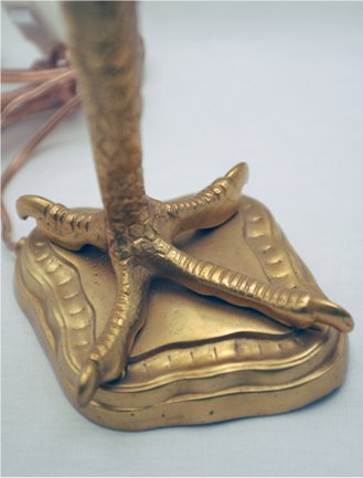 PAIR OF FRENCH DORE BRONZE LANTERN LAMPS: Converted to electricity. Very unusual form of bird with worm in his mouth, the worm holds the hammered shade. The base is in the form of a bird claw. 17''h.