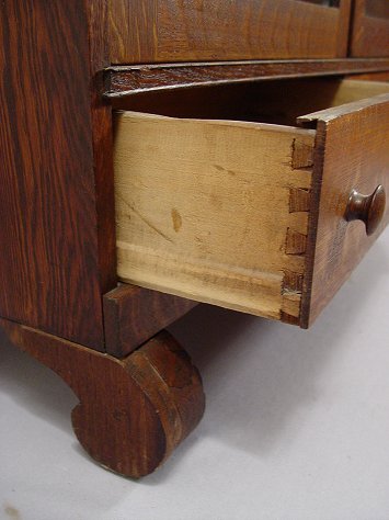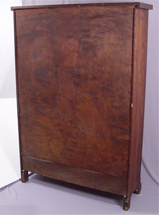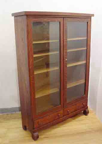 GOLDEN TIGER OAK DOOR BOOKCASE CABINET: Double glass doors over a pair of half length drawers. Adjustable interior shelves. 55 3/4'' x 42 3/4'' x 13''.