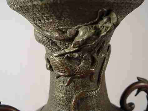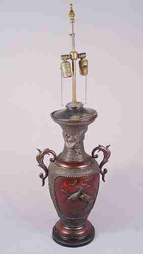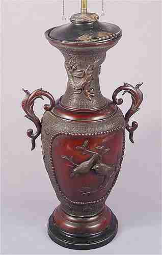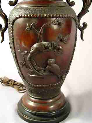 JAPANESE BRONZE VASE MOUNTED AS A LAMP: Highly detailed animal and bird design, 19''h.