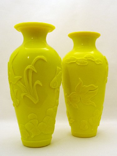 PAIR OF PEKING GLASS VASES: Yellow over yellow in a fish design, 9 3/4''h.