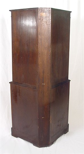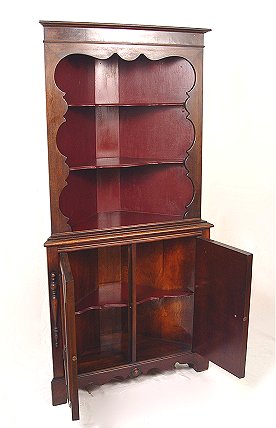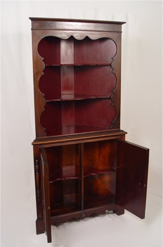 DIMINUTIVE MAHOGANY CORNER CABINET: Open shelving on upper half, cabinet storage on lower section. High quality early 20th C. American manufacture. 64''h. x 27 1/2'' x 13''.