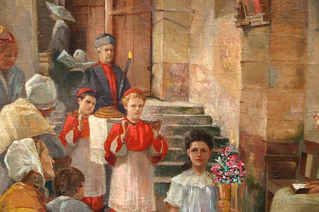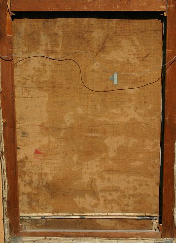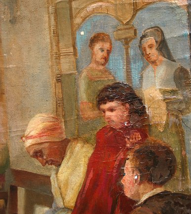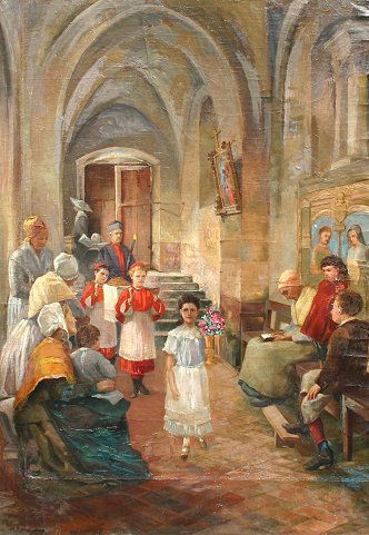 CHURCH INTERIOR WITH GIRL W/FLOWERS, O/C: Overall 42'' x 30 1/2'', possibly signed lower right. Heavily worked, with reglued canvas, inpaint throughout, with several paint flecks. A restorers project certainly worth looking into. Sold as is.