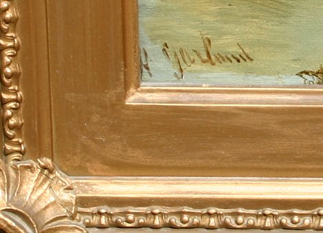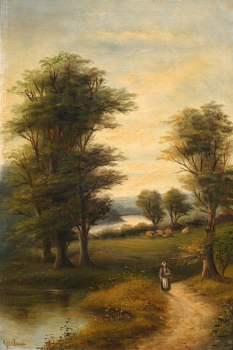 LANDSCAPE WITH SHEEP AND LADY ON PATH, O/C: 27 1/2'' X 21 1/4'', signed Garland.