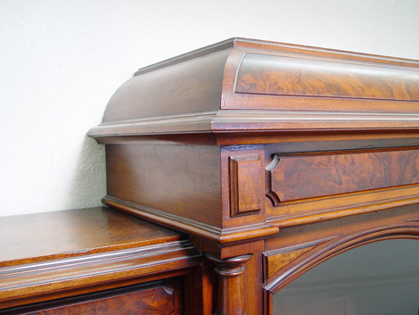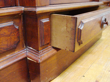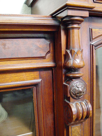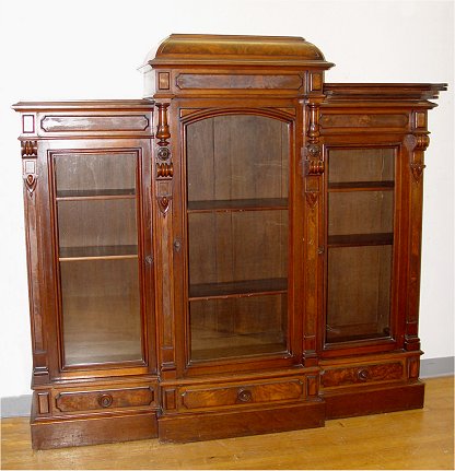 SUPERB VICTORIAN WALNUT BOOKCASE CABINET: Three sections with the center being extended and having an arched glass door and half domed top. Carved stiles, three drawers across the bottom with burled panel fronts. 66''h. x 70'' x 16 3/4''.