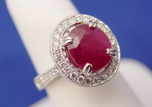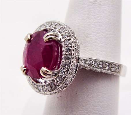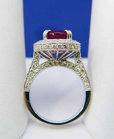 SPECTACULAR RUBY & DIAMOND RING: 6.92ct oval mixed cut ruby set in 18k white gold with approx. 2.16ctw of round brilliant cut diamonds, H VS. Don't miss the view of this lovely from the side. Size 7, 10 grams. Sold with current Florida Diamond Appraisers appraisal, retail replacement value $6,345. Est. $2500/3000**