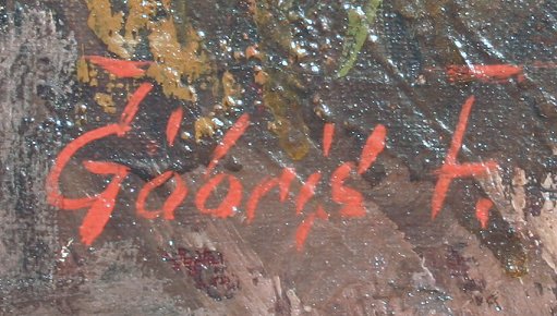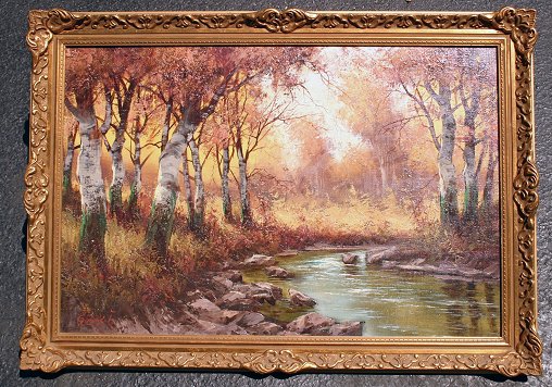 BIRCH FOREST LANDSCAPE WITH CREEK O/C SIGNED GOORIS?: 24'' x 36'', great gilded frame, 28'' x 41''.