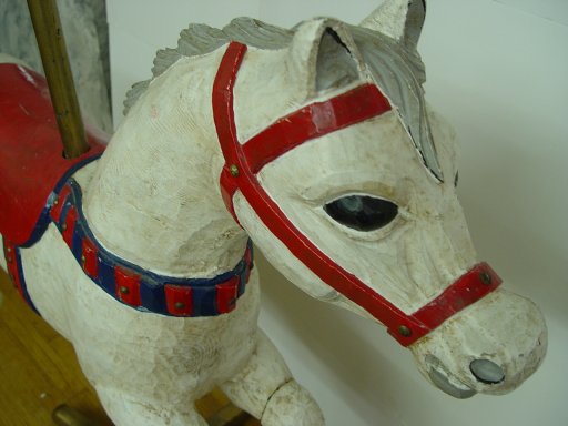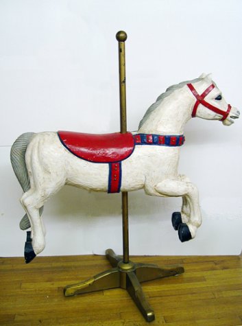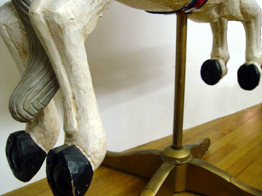 FOLK ART WOODEN CAROUSEL HORSE, CA.1910: Hand carved with paint decoration, approx. 4' nose to tail and 3' ear to hoof, mounted on gold gilt metal pole 56 1/2''h. overall.