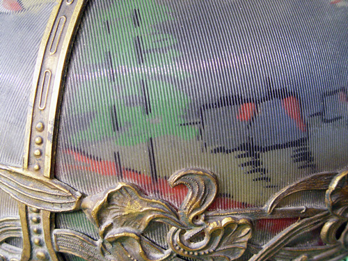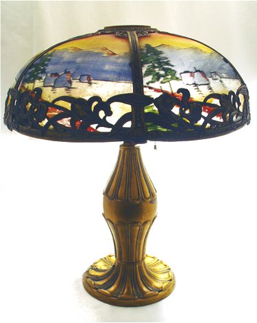 VINTAGE REVERSE PAINTED TABLE LAMP: Domed shade with 6 panels painted in the same scene. 2 pull chain sockets. Lamp is 21'' tall, shade is 17 1/2'' dia.