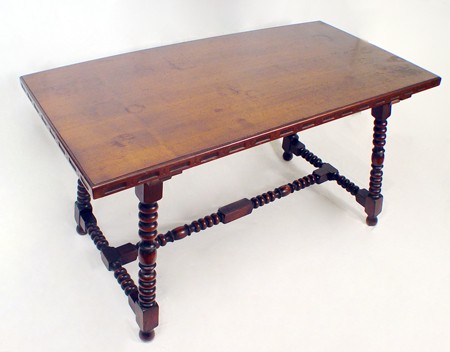 SPANISH COLONIAL STYLE LIBRARY TABLE: Mahogany trestle table with spool turned legs and stretchers, carved edging to top and impressed 4504 to bottom of apron, some wear to top surface, approx. 27'' x 53 3/4'', 28 1/2''h.