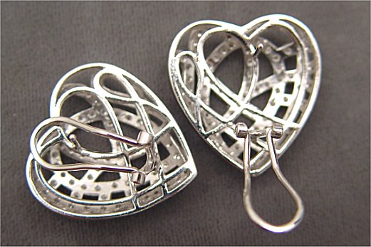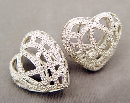 FILIGREE DIAMOND HEART EARRINGS: 18K white gold filigree puffed hearts set with approx 1 ctw full cut white diamonds, post omega backs, approx. 1'', 28 grams. Est. $500/700**