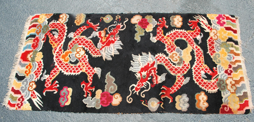 TIBETAN HAND TIED DRAGON RUG: Approx. 3'2'' x 6'2 1/2''. Colorful dragons on black ground.