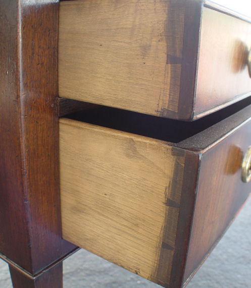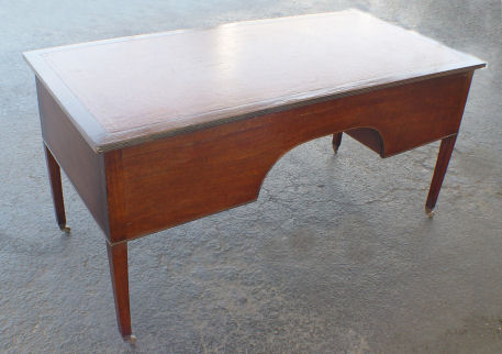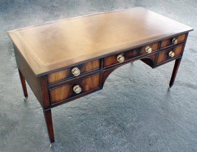 ENGLISH MAHOGANY HEPPLEWHITE STYLE DESK: Late 19th C, five drawer desk, veneered drawer fronts with substantial pulls, dovetail construction with machine chamfered bottoms, tapered legs ending in castors, leather surface, 30 1/2'' x 63'', 30''h.
