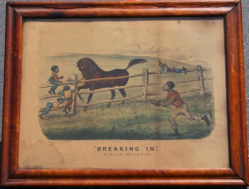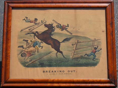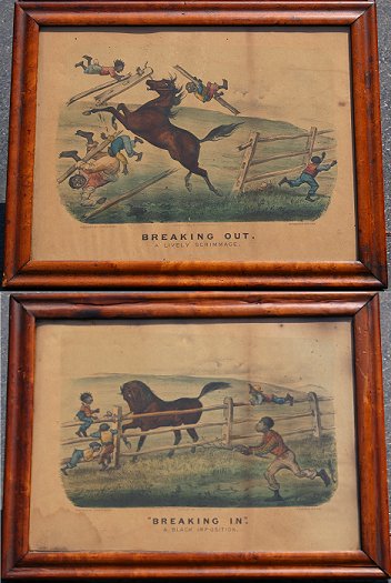 CURRIER & IVES BLACK PRINTS: ''Breaking In; A Black Imposition'', and ''Breaking Out; A Lively Scrimmage'', sight size 12 1/4'' x 16 1/4'', original frames with wear, 16'' x 19''. Staining throughout both pieces, sold as is.