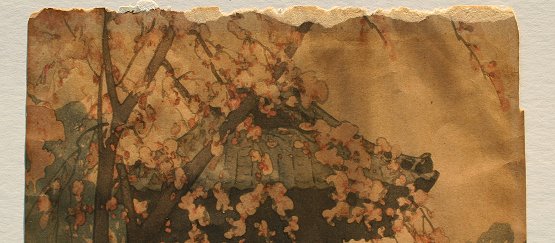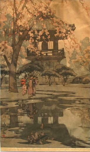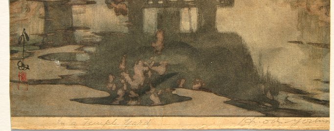 HIROSHI YOSHIDA WOODBLOCK PRINT: ''In a Temple Yard'', 15'' x 9'', pencil signed, stamped title. Trimmed margins, torn top margin, toning/moisture damage, sold as is.