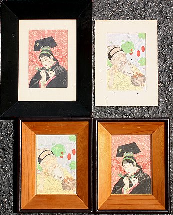 4 JACOULET MINI WOODBLOCK PRINTS: 3 pieces framed, unframed one is damaged by insects, sold as a group, approx. 6'' x 4 1/4'', ''Les Jades Chinoise'', and ''Le Nid''.