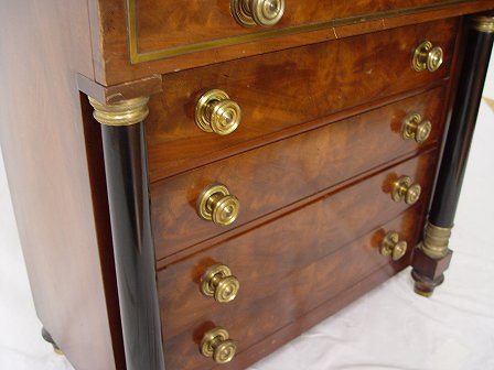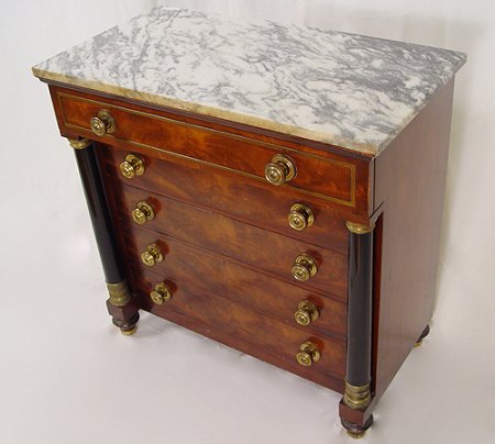 FRENCH EMPIRE STYLE MARBLE TOP CHEST: Striking details featuring the black columnar stiles with ornate brass fittings, brass pulls and gray marble top. The top drawer overhangs 4 lower drawers. American manufactured by Kent of Grand Rapids. 29 3/4''H. x 30'' x 16''.