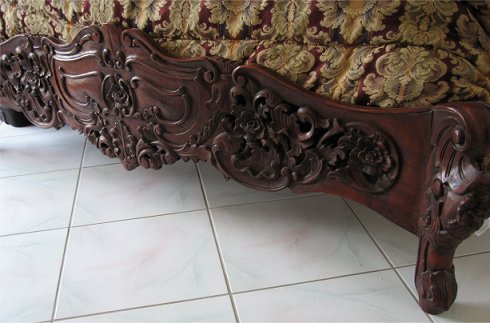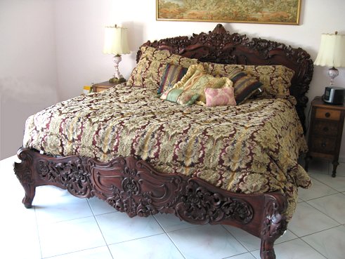 CARVED TO DEATH MAHOGANY KING SIZE BED: Nicely carved 20th C bedstead. Headboard is 59 1/2''h., footboard is 24''h. Accommodates a mattress 80''l. x 76''w.