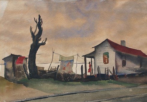 NUNGESTER, Mildred, (American, 1912-): Southern Scene with Black Folks, W/C, 13 1/4'' x 19 1/2'', unsigned, worn frame, 20'' x 28 1/2'', inscribed verso, ''Painted by Mildred Nungester, Montgomery, Ala., friend of Ruby Pickett Tartt''. Toned throughout, needs new mat due to burn/browning.