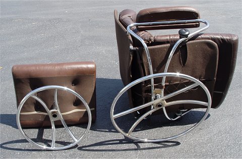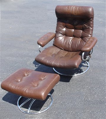 EKORNES TYPE LEATHER RECLINING CHAIR AND OTTOMAN: Swivel and reclining action. The leather is button and tufted (one button missing on seat). Chrome base, leather is moderately worn on the arms. Made in Norway label. 39'' x 24 '' x 34''.