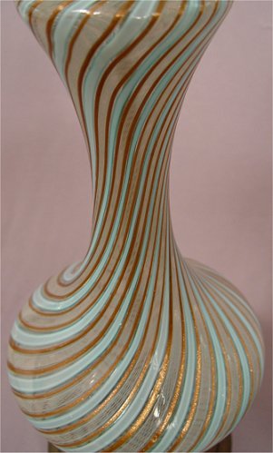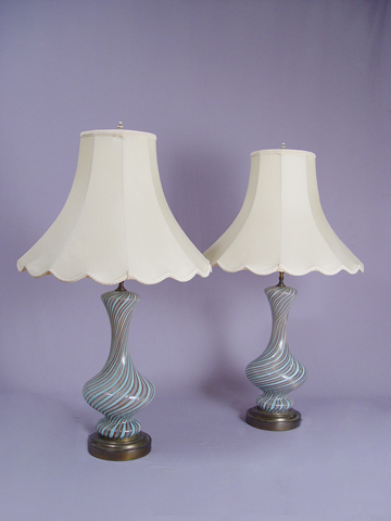 PAIR ITALIAN ART GLASS LAMPS: Latticino and aventurine striped with aqua glass. The glass itself is 16''h. the lamps are 34''h. overall.