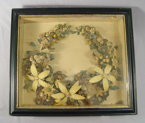 VICTORIAN WREATH OF SEEDS AND GRAIN: Encased in the original deep frame under glass. Made of a great variety of seeds, 25 1/2'' x 29 1/2'' x 4 1/2''.