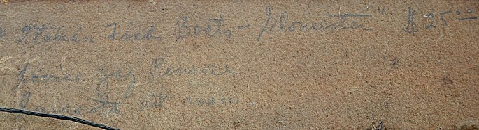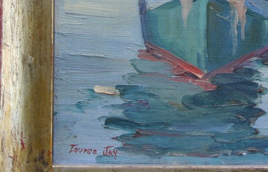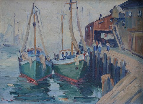PENROSE, Louise Jay, (American, 20th C): ''Italian Fish Boats, Gloucester, O/CB, 12'' x 16'', signed LL, titled verso, Sarasota Art Assoc., worn gilt frame, 15'' x 19'', needs cleaning.