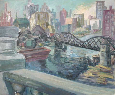DRUCKER, R.L., (American, 20th C): ''No. River Bridge, Chicago'', O/CB, 24'' x 30'', signed, titled verso, framed, 27'' x 33''.