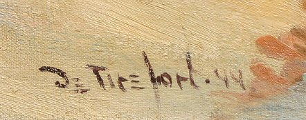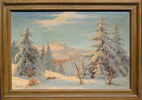 DeTIREFORT, Bela, (American, 20th C): Winter Landscape, O/C, 24'' x 36'', signed and dated '44, frame with wear, 30'' x 42''. Needs cleaning, mild/med. craquelure throughout.