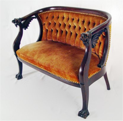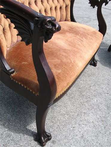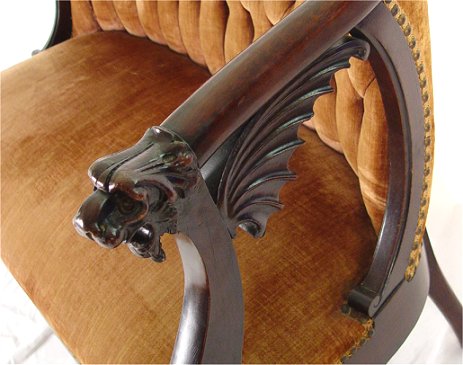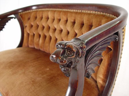 ROSEWOOD VICTORIAN LION CARVED SETTEE: Lion head hand holds, with wings under the arm rests. Straight crest curves to arms. Tufted back. 32 1/2''h. x 47''l. x 24'' deep.