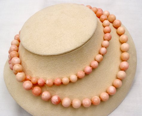 ANGEL SKIN CORAL BEAD NECKLACE: 32'' strand of pink coral beads, 10.5mm to 8.5mm, double knotted.