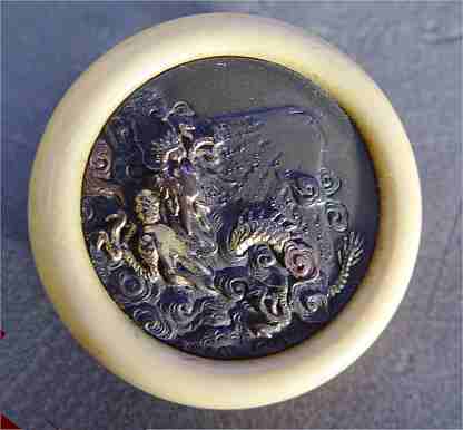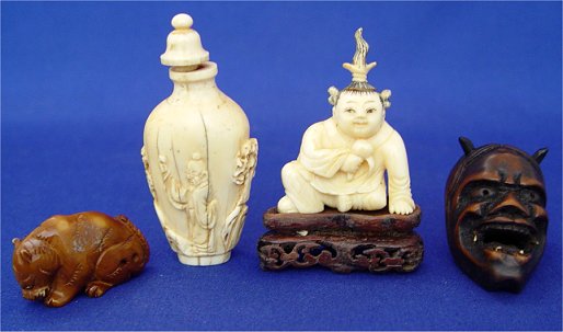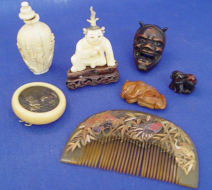 ESTATE FIND OF ORIENTAL CARVINGS AND TRINKETS: 1) Ivory snuff bottle with age shrink cracks, 3''h. 2) Carved wood devilish head, 2'' 3) Carved ivory netsuke on wood stand 4) Comb with iridescent and gold painted decor 2 1/2'' x 4'' 5) Carved stone netsuke 6) Ivory button with gold and bronze scenic insert, 1 3/4'' dia.