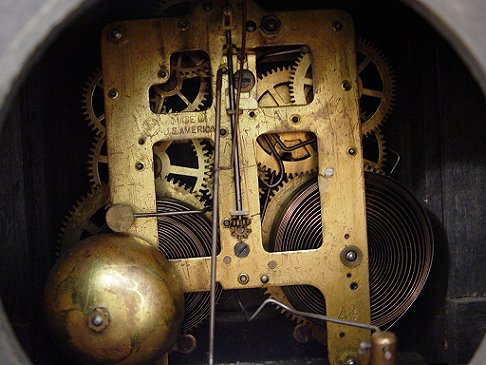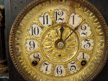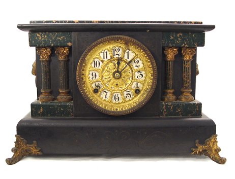 SETH THOMAS MANTLE CLOCK: Faux marble, top and columns, ornate brass over enamel dial. The dial states ''made by Seth Thomas Thomson Conn.'' 11''h x 16 1/2''w x 7'' d.