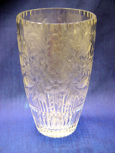 SIGNED LALIQUE INTAGLIO CUT CRYSTAL VASE: 8'' h., 5''dia. in a floral design, signed in block letters. Free of chips or cracks.