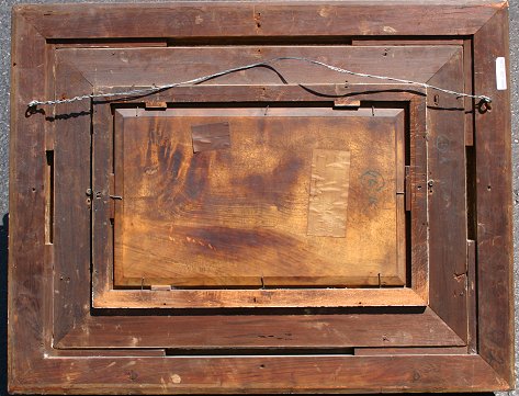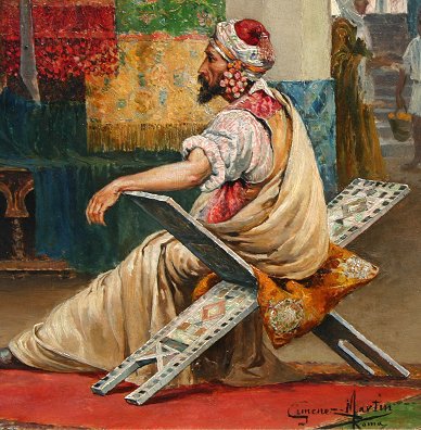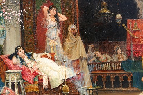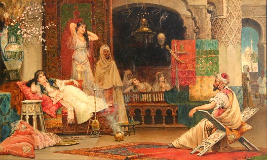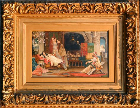 JUAN (G)JIMINEZ Y MARTIN, (Spanish, 1858-1901): Orientalist Harem Scene, O/Wood, 9'' x 15'', signed Jimenez Martin, Roma, period gilded frame with minor wear and repair.